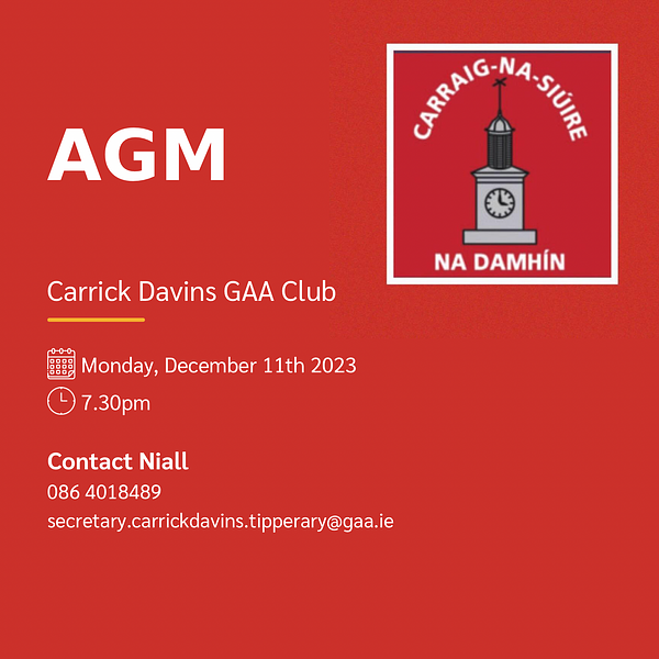 Please send any motions to our Secretary Niall Ryan on 086 4018489 or email secretary.carrickdavins.tipperary@gaa.ie
